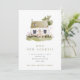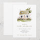 Um novo endereço lindo/novo anúncio de casa com uma ilustração em aquarela de uma cabana com quintal com grama e flores silvestres coloridas.
