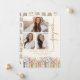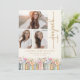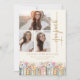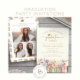 Anúncio de Formatura com Livros. Celebre esse marco com estilo com um anúncio de formatura personalizado que exibe lindamente três de suas fotos favoritas na frente, combinadas com ilustrações pintadas à mão em aquarela de livros e delicadas flores silvestres da primavera e do verão em tons suaves de rosa, azul, verde e dourado. A fonte da máquina de escrever vintage e a caligrafia dourada em um fundo marfim adicionam um charme literário atemporal de biblioteca. O padrão coordenado no verso une o design para uma aparência elegante e sofisticada. Personalize as palavras, estilos de fonte, tamanhos e fundos para criar um souvenir que realmente reflita sua jornada. Compartilhe sua conquista com um design tão único quanto sua história — comece a personalizar hoje! (o texto "graduate" NÃO pode ser alterado)