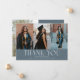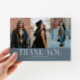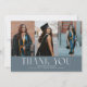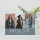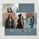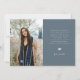 Cartão de foto de anúncio de graduação moderno e elegante com 3 fotos na frente e 1 no verso. O texto diz "OBRIGADO". Adicione o nome do graduado, informações e mensagem para personalizar este cartão. Cor azul lousa.