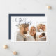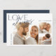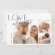 Um elegante cartão de noivado de colagem de fotos com três fotos (um quadrado e dois horizontais), com "amor sempre" em blocos modernos e letras de guião ao longo do lado superior e esquerdo. Personalize com sua mensagem personalizada (mostrada com "estamos noivos!") e seus nomes.