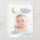 Um design de anúncio de nascimento divertido, mas elegante, que apresenta sua foto em forma de arco com roteiro de na moda caligrafia e estrelas desenhadas à mão, nuvens e lua crescente. A parte de trás apresenta uma colagem de 3 fotos e mais estrelas. Visite a coleção para ver mais.
