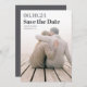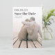 Uma tipografia moderna e limpa, salve a design de data, apresentando uma foto vertical ou orientada para o retrato de cheio com "salve a data", a data do casamento, os nomes e a localização alinhados no topo esquerdo, em caracteres clássicos. Adicione detalhes adicionais, como o site do seu casamento, às costas.