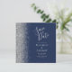A borda esquerda deste elegante casamento moderno salve o cartão de data apresenta uma borda cintilante. O texto personalizável combina a escrita manual de cinzas prateadas, fontes copperplate e itálico em um fundo azul marinho. O verso apresenta um marinho e um design prateado correspondentes.