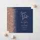 A borda esquerda deste elegante casamento moderno salve o cartão de data apresenta um rosa dourado falso borda brilhante. O texto personalizável combina a escrita manual rosa-rosa, a placa de impressão e as fontes itálicas em um fundo azul-marinho. O verso apresenta um design marinho azul e rosa dourado correspondente.