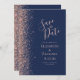 A borda esquerda deste elegante casamento moderno salve o cartão de data apresenta um rosa dourado falso borda brilhante. O texto personalizável combina uma letra pálida de cor azul rosa, uma letra colorida, uma placa de impressão e fontes itálicas em um fundo azul marinho. O verso apresenta um design marinho azul e rosa dourado correspondente.