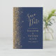A borda esquerda deste elegante casamento moderno salve o cartão de data apresenta uma borda falsa dourada. O texto personalizável combina uma letra pálida de cor dourada, uma letra copperplate e uma letra itálico num fundo azul marinho. O verso apresenta um design marinho azul e dourado correspondente.