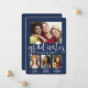 É uma formatura tripla! Anuncie a conquista de três formando com anúncios personalizados de colagem de fotos de graduação em conjunto com na moda. As fotos e o texto deste modelo são simples de personalizar para cartões de anúncio ou convites de festas de formando. Além disso, as cores podem ser personalizadas com a ferramenta design Zazzle. (DICA DE IMAGEM: Uma maneira fácil de posicionar uma foto exatamente como você deseja é recortá-la antes de carregá-la no site do Zazzle.) O moderno design azul e branco apresenta uma caligrafia de script de estilo manuscrito com um boné de conselho de morteiro, uma elegante tipografia clássica e cinco fotos de sua escolha, como fotos de mais velho ou imagens da cerimônia de início. Este convite para a formatura é uma forma na moda para anunciar uma celebração especial para três formandos, como irmãos, melhores amigos, primos, trigêmeos, colegas de equipe, irmãos e irmãs, etc. Parabéns aos formandos!