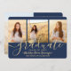 Compartilhe a alegria de um segundo grau ou formandos com anúncios personalizados de marinho de colagem de 4 fotos, azuis e dourados, descarregáveis. As imagens e todos os textos deste modelo digital são simples de personalizar com quaisquer detalhes de sua escolha, como informações sobre convites de festas, nomes de pais, honras especiais, título de grau, citação inspiracional favorita, informações de contato do formando ou planos para o futuro. (DICA DE IMAGEM: Uma maneira fácil de centralizar uma foto exatamente como você deseja é recortá-la antes de carregá-la no site do Zazzle.) O design apresenta a tipografia moderna, a caligrafia de script de tendências de chic com um boné de conselho de morteiro e quatro fotos de sua escolha, como fotos de mais velho ou imagens da cerimônia de início. Observe que o ouro é impresso a cor, não a folha metálica. Estes cartões de anúncio de na moda são uma maneira elegante de compartilhar uma celebração especial de dia com a família e os amigos. Parabéns ao formando!