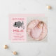 Cartão de anúncio de nascimento bonito com ilustração e textos iluminados. O texto diz "mas primeiro, leite", com um gato olhando de fome com leite bebendo. O nome do seu filho e as estatísticas de nascimento podem ser adicionados abaixo disso. Sua primeira foto pode ser adicionada a esses textos e ilustrações. Outra imagem pode ser adicionada à parte traseira do cartão juntamente com os nomes dos pais.