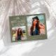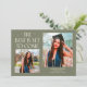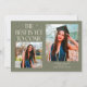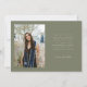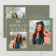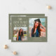 Cartão de foto de anúncio de graduação moderno e caprichoso com 2 fotos na frente e 1 no verso. O texto diz "O Melhor Está Por Vir" com estrelas cintilantes. Adicione o nome do graduado, informações e mensagem para personalizar este cartão. Cor verde sage.