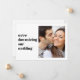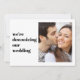 Um anúncio de casamento moderno minimalista para informar familiares e amigos da sua lista original de convidados que as circunstâncias o obrigaram a reduzir o número de convidados no seu casamento. Na frente, "estamos reduzindo o tamanho do nosso casamento" é escrito em uma tipografia simples ao lado da sua foto favorita. No verso, você pode personalizar sua mensagem em mais detalhes e adicionar informações sobre transmissão ao vivo, celebrações futuras e site do casamento.