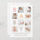 Anuncie a chegada da sua nova menina com nossas cartas simples e modernas de bloqueio de bebês e cartão de anúncio de colagem de fotos. O design apresenta oito imagens para mostrar as fotos do seu novo bebê. "BABY" é apresentado em letras de blocos multicoloridas modernas no esquema de grelha. Personalize com o nome do bebê, data de nascimento, estatísticas de nascimento e o nome do pai. O verso apresenta as letras "BABY" penduradas numa corda com pequenos corações e o nome do bebê. Nota: as cores podem ser alteradas de acordo com sua preferência.