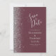 A borda esquerda deste elegante casamento moderno salve o cartão de data apresenta uma borda cintilante. O texto personalizável combina a escrita manual de cinzas prateadas, fontes em copperplate e itálico em um fundo de burlagem escura. O lado inverso apresenta uma burgundy e uma design prateada correspondentes.