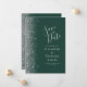 A borda esquerda deste elegante casamento moderno salve o cartão de data apresenta uma borda cintilante. O texto personalizável combina a escrita manual de cinzas prateadas, fontes copperplate e itálico em um fundo verde esmeralda escuro. O verso apresenta um design verde e prateado correspondentes.