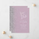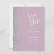 A borda esquerda deste elegante casamento moderno salve o cartão de data apresenta uma borda cintilante. O texto personalizável combina manuscrito branco, fontes em copperplate e itálico em um fundo lilático empoeirado. O verso apresenta um lilás empoeirado e design prateado correspondentes.
