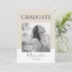 This elegant graduation announcement design features a modern, minimalist layout in warm neutral tones of white and light brown. The front showcases the word “GRADUATE” in a clean, all-caps sans-serif font centered above a customizable photo of your graduate. Beneath the photo, your graduate’s name, school, and class year are displayed in a delicate handwritten script font, adding a personal and refined touch.