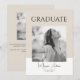 This elegant graduation announcement design features a modern, minimalist layout in warm neutral tones of white and light brown. The front showcases the word “GRADUATE” in a clean, all-caps sans-serif font centered above a customizable photo of your graduate. Beneath the photo, your graduate’s name, school, and class year are displayed in a delicate handwritten script font, adding a personal and refined touch.
