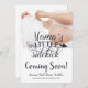 Um anúncio de gravidez de um bebê fofo moderno com texto ilustrado de caligrafia lendo o pequeno ajudante da mamãe. O roteiro moderno diz: em breve!