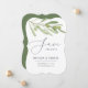 Um ramo de oliveira ousado acompanha os detalhes pessoais do seu casamento neste atemporal design de cartão de anúncio. As folhas em aquarela em tons verdes suaves são perfeitamente equilibradas no fundo branco, dando um visual sofisticado. A adição de uma cor ousada no verso acrescenta à sensação de elegância e qualidade. Parte de uma coleção de casamento na moda.