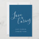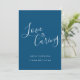 O amor é carinho, cartão de casamento distante social ou cartão de folga. Personalize este cartão com os seus nomes e uma pequena mensagem sobre as suas orientações de distanciamento social. Parte do coração tipográfico simples correspondente no jogo de casamento azul escuro e branco. Ideal usar como cartão de casamento para informar aos seus convidados sobre mudanças de casamento que a pandemia ou outras mudanças o forçaram a introduzir medidas de distanciamento social para protegê-lo e a todos os seus convidados. A redação pode ser alterada de acordo com as suas necessidades. Outras opções de cor estão disponíveis. Design original de Sarah Trett para www.mylittleedenweddings.com no Zazzle.
