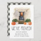Anúncios móveis do Dia das Bruxas com uma bela porta frontal decorada com um fantasma, jack-o-lanternas, abóboras, luzes e aranhas. Personalize os anúncios móveis do Dia das Bruxas com seu nome e endereço em letras negras modernas. O anúncio em movimento inverte-se para um padrão de xadrez de creme e de búfalo de cor branca.
