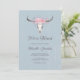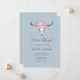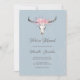 Anunciou que se mudou com este cartão postal comovente do tema russo. Este design boho apresenta um crânio de vaca desenhado à mão com um vestido cor-de-rosa pincelado de cabeça floral de rosas delicadas sobre um fundo de madeira cinza azul e de couro. Parabéns pela sua nova casa! Desenhado pela artista ©Susan Coffey.