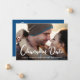 Mesmo que as circunstâncias tenham exigido o adiamento da data do seu casamento, mostre aos seus convidados que o seu amor continua com a sua fotografia de noivado favorita neste cartão de anúncio de mudança de data de casamento. Na frente, "Mudança de Data" é escrito em uma grande fonte branca contemporânea na parte inferior da sua foto, e abaixo você pode personalizar seus nomes e anúncio de adiamento. No verso, você pode personalizar sua mensagem em mais detalhes e adicionar a nova data e local do casamento, tudo em uma tipografia branca simples contra um fundo azul clássico.
