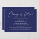 Anúncio moderno e minimalista de mudança de planos, adiamento ou cancelamento de casamento azul marinho. "Mudança de Planos" é escrito em uma fonte branca estilosa e você pode personalizar facilmente se o casamento foi cancelado ou adiado ou se outros detalhes foram alterados.