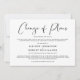 Se circunstâncias como as diretrizes de distanciamento social exigirem que você reduza a presença no seu casamento, você pode informar familiares e amigos na sua lista de convidados estendida original com este anúncio de casamento reduzido moderno e minimalista, porém elegante, em preto e branco. "Mudança de Planos" é escrito em uma fonte estilosa e você pode personalizar facilmente a mensagem de redução do casamento com mais detalhes e adicionar qualquer transmissão ao vivo da cerimônia, celebrações futuras e informações do site do casamento. No verso, você pode personalizar com uma foto favorita.