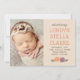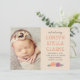 O cartão à moda do anúncio do nascimento da foto para introduzir seu bebé do doce caracteriza duas fotos recém-nascidas (parte dianteira e parte traseira) com um design de texto à moda que caracterize o nome completo do seu bebê e o stats do nascimento. O bege neutro, a laranja de cobre, e as cores cinzentas mornas podem ser alterados para coordenar com suas fotos. O crisântemo do outono floresce nas máscaras da laranja e e do acento roxo da ameixa o design.