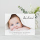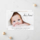 Simples anúncio de nascimento de fotografia para anunciar a chegada do seu bebê à família e aos amigos. A foto de seu recém-nascido preenche a frente e está sobrecarregada com "ela está aqui!" "ele está aqui!" ou "Estou aqui!" em um roteiro contemporâneo (você pode mover este texto para outra área no cartão para se adequar à sua foto selecionando a edição na ferramenta design). Adicione seu nome, data de chegada e estatísticas de nascimento. No verso, adicione quatro fotos adicionais, uma mensagem "bem-vinda" e os nomes dos pais e irmãos.
