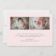 Cartão de anúncio de nascimento de fotografia com um simples design com um cheio sangrando uma imagem horizontal na frente com o nome do bebê em um roteiro elegante com baloiços e suas estatísticas de nascimento abaixo. O verso é cor-de-rosa pincelado com duas fotos horizontais e sua mensagem personalizada. Esta elegante carta de anúncio de nascimento é uma forma excelente de anunciar a chegada da sua bebê recém-nascida.