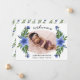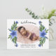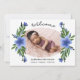 chá de fraldas de fotos florais bonito e na moda com um quadro oval adornado com ilustrações de cor d'água de flores azuis e folhas verdes, o texto "Bem-vindo" em um guião solto, um espaço reservado para uma foto horizontal e campos de texto editáveis para seus detalhes em um tipo serif sofisticado. Cartões invertidos a um padrão diagonal de botões de flores azuis e folhas verdes. Personalize facilmente este design para corresponder ao seu estilo clicando em "Personalizar" para ir para a ferramenta design e adicionar o seu próprio texto ou detalhes personalizados.