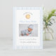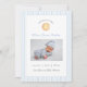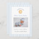 Cartão de anúncio de nascimento de um bebê bebezinho, de cor aquosa e simples, com foto com borda azul e branca de faixa de pinos.