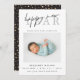 Cartão de nascimento de Ano Novo moderno e elegante. Design apresenta a foto do solteiro do bebê, a escrita do feliz ano novo em letras modernas, estatísticas de natalidade, nome, mensagem e padrão festivo de bolinhas de ouro no verso da carta. Maneira perfeita de anunciar o nascimento do seu bebê e desejar a todos um Feliz ano novo!