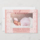 Aqui está uma forma doce e adorável de receber sua nova princesa no mundo com um anúncio de nascimento personalizado para enviar amigos e família. A design inclui uma combinação rústica maravilhosa de renda branca e burlap rosa com a palavra "bem-vindo" em letras de script. Adicione sua foto favorita de bebê recém-nascido junto com seu nome, informações sobre natalidade e os nomes dos pais felizes. A parte traseira da placa continua o design com uma braçadeira rosa e um lugar. Que divertido! Fique à vontade para entrar em contato comigo se tiver perguntas sobre design ou quiser ver este design em outro produto. Você pode me enviar um e-mail em: jschmidtdesignworks@gmail.com. Aproveite sua nova vida!