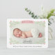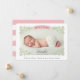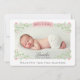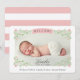Folhas e flores deliciosas design em verde-claro e rosa formam um canto "quadro" sobre sua foto no meio. O dorso tem listras modernas em rosa e branco (o rosa pode ser personalizado para qualquer cor que você quiser). Compartilhe suas grandes notícias com a família e amigos com estilo!