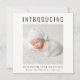 Um anúncio elegante e minimalista de nascimento quadrado para apresentar seu bebê recém-nascido a amigos e familiares com "Apresentando" no topo em letras grandes, sua foto e seu nome, data de nascimento e estatísticas de nascimento em uma simples tipografia moderna. No verso, adicione sua mensagem personalizada.