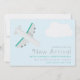Um adorável cartão de anúncio aeronáutico com tema "baby", com ilustração digital de uma cinza e avião verde num céu azul com nuvem branca. "Nova Chegada" está na cinza moderna, e o nome do seu garotinho em jade verde. O reverso/backer apresenta nuvens brancas flutuantes em um céu azul claro.