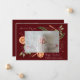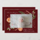 Cartão de nascimento de feriado russo e moderno com 2 fotos do seu recém-nascido com ilustração aquosa de botânicos de inverno, incluindo maleta, ramificação de pinheiros, bagas, laranja, etc. O fundo é vermelho-vivo.