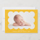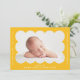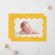 Anúncio de nascimento simples e moderno com a fotografia do seu bebê aninhada dentro de uma imagem amarela brilhante escalpada. Personalize o anúncio de parto amarelo adicionando o nome do seu bebê e informações adicionais em letras brancas. A parte traseira da placa apresenta um design mínimo de faixa amarelo e branco.