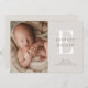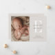 O anúncio de nascimento de três fotos do bebê neutro moderno inicial mostra sua foto vertical na frente, junto com a inicial do bebê. Mais duas fotos estão atrás.