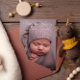 Photo birth announcement personalized with a big photo on the cover and three more photos on the back. Your baby's name in a white signature script along with their last name at the top, and birth stats at the bottom. Beautiful new baby announcement that works for both boys and girls.