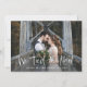 Este simples e elegante cartão de anúncio de fuga para casamento apresenta uma foto pessoal do casamento na frente, com as palavras "nos casamos" em escrita rústica e branca à mão. O verso do cartão tem espaço para outra foto, além de espaço para detalhar os pormenores da fuga ou fornecer detalhes para uma recepção ou celebração após o casamento. Um design elegante que é a maneira perfeita de informar amigos e familiares que você está casado!