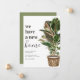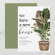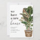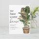 Cartão de anúncio de mudança moderno com um fundo branco simples, uma planta de casa pintada à mão rústica em aquarela, o ditado 'temos uma nova casa', e seu novo endereço.