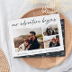 Um cartão de noivado moderno e excitante para o casal de espírito de aventura, este design simples e limpo apresenta três fotos horizontais ou orientadas à paisagem em um layout de colagem em grade, com "nossa aventura começa" acima em um roteiro escrito à mão. Personalize com seu anúncio, nomes e detalhes adicionais na parte inferior.