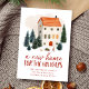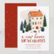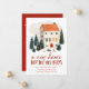 Anúncio elegante, comovente no feriado, com uma confortável casa aquosa cercada de pinheiros nevados com um cão e uma pessoa puxando uma árvore de Natal num trenó. "Uma nova casa para os feriados" é exibida em caracteres vermelho-ferrugem. Personalize o design com seu nome e endereço. A carta se reverte para um fundo vermelho-nevado.