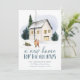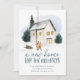 Anúncio elegante, comovente no feriado, com uma confortável casa aquosa rodeada de pinheiros nevados, com duas pessoas à frente, no vestido de inverno. "Uma nova casa para os feriados" aparece em letras escuras à mão azul-gelo. Personalize o design com seu nome e endereço. A carta se reverte para um fundo azul-gelo escuro nevado.