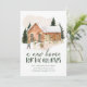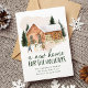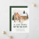 Anúncio elegante de feriado com uma acolhedora casa de tijolos aquosos cercada por pinheiros leves de neve com duas pessoas construindo um boneco de neve na frente. "Uma nova casa para os feriados" é exibida em letras verdes escuras. Personalize o design com seu nome e endereço. A carta se inverte para um fundo verde escuro nevado.