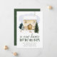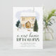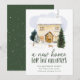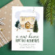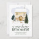 Anúncio elegante e comovente com uma acolhida aquarela confortável cercada por pinheiros com neve e coelhos bonitos na neve. "A New Home For The Holidays" é exibido em letras verdes de pinheiro escuro. Personalize o design com seu nome e endereço. A carta se inverte para um fundo verde escuro nevado.